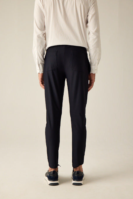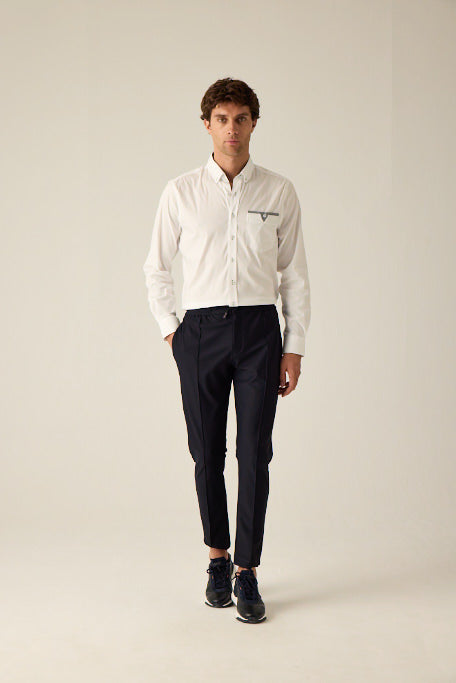 Der Bund mit seitlichen Gummizügen sorgt für perfekten Sitz, während eine feine Nadelnaht mit Bügelfalte dem Design eine klassische Note verleiht.